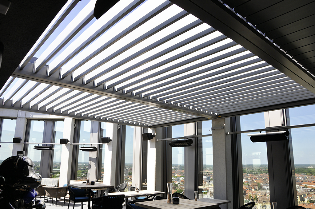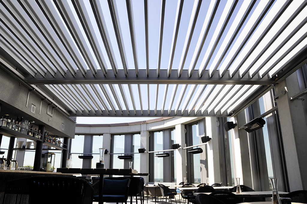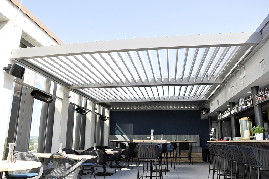 Die drei individuell verstellbaren Terrassendächer bieten nun bei jeder Wetterlage den gewünschten Schutz für die Gäste. Sei es bei Wärme und Sonnenschein im Sommer, genauso wie bei windiger Wetterlage oder bei kühlen Temperaturen und Regen. Das Lammellendach kann vollständig geschlossen werden.