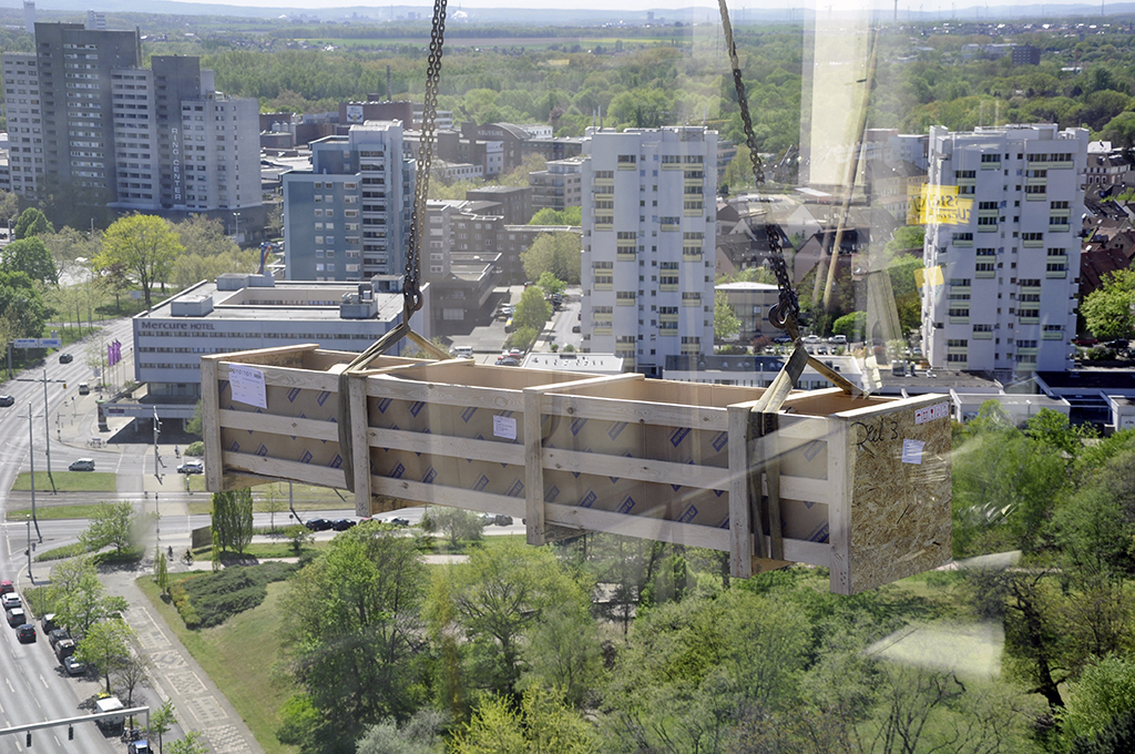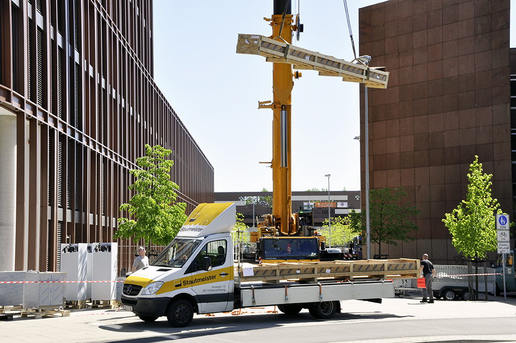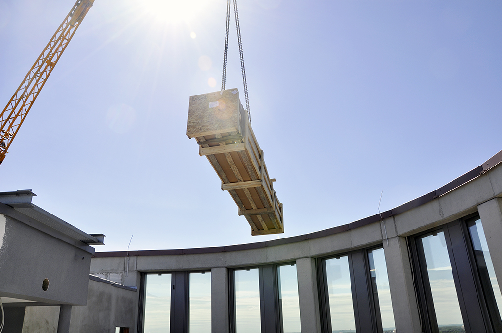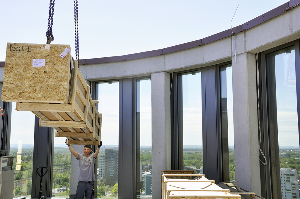 Der Transport des Materials auf die Dachterrasse stellte eine besondere Herausforderung, auch in Sachen Koordination, dar. Das Material des Terrassendachs wurde mit zwei Transporterladungen angeliefert, um dann direkt von dem bereitgestellten Schwerlastkran auf die Terrasse gehoben zu werden.